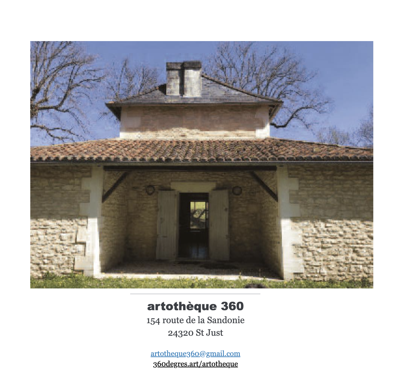 ARTOTHÈQUE 360° Entre Dordogne et Charente, une artothèque au village Peintures disponibles à l’ARTOTHÈQUE 360° Ouvert les dimanches de 15 h à 18 h – Inauguration le 23 novembre 2025 https://360degres.art/ 154 route de la Sandonie, 24320 Saint Just ARTOTHÈQUE 360°