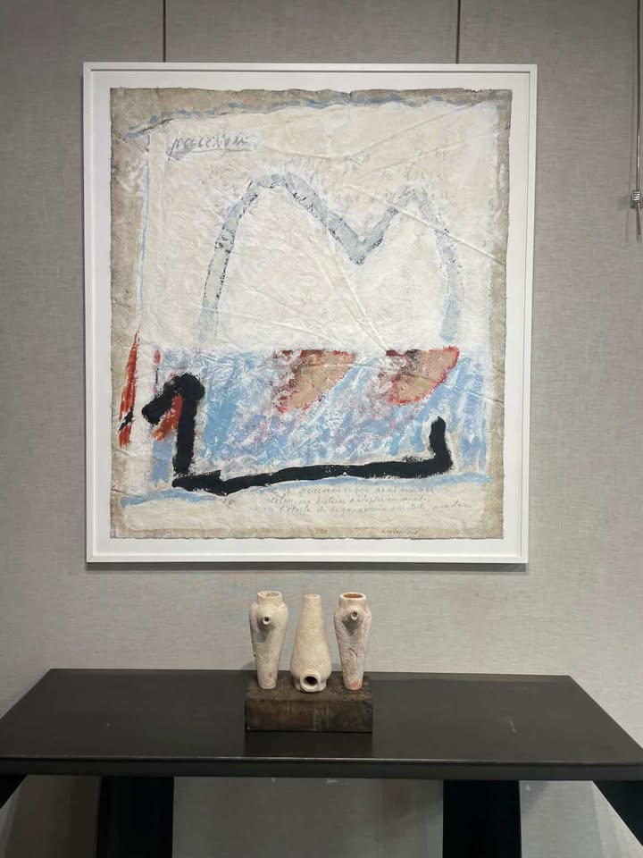 Le titre de l’exposition, emprunté au poète austro-hongrois Rilke, agit comme une chambre souterraine : Au plus secret, pleure une source. Ici, la source ne jaillit pas, elle veille, retenue, antérieure aux formes. Car avant les cartes, avant les frontières, avant même les récits, il y eut les eaux primordiales : Celles qui portent. Celles qui engloutissent. Celles qui regardent.